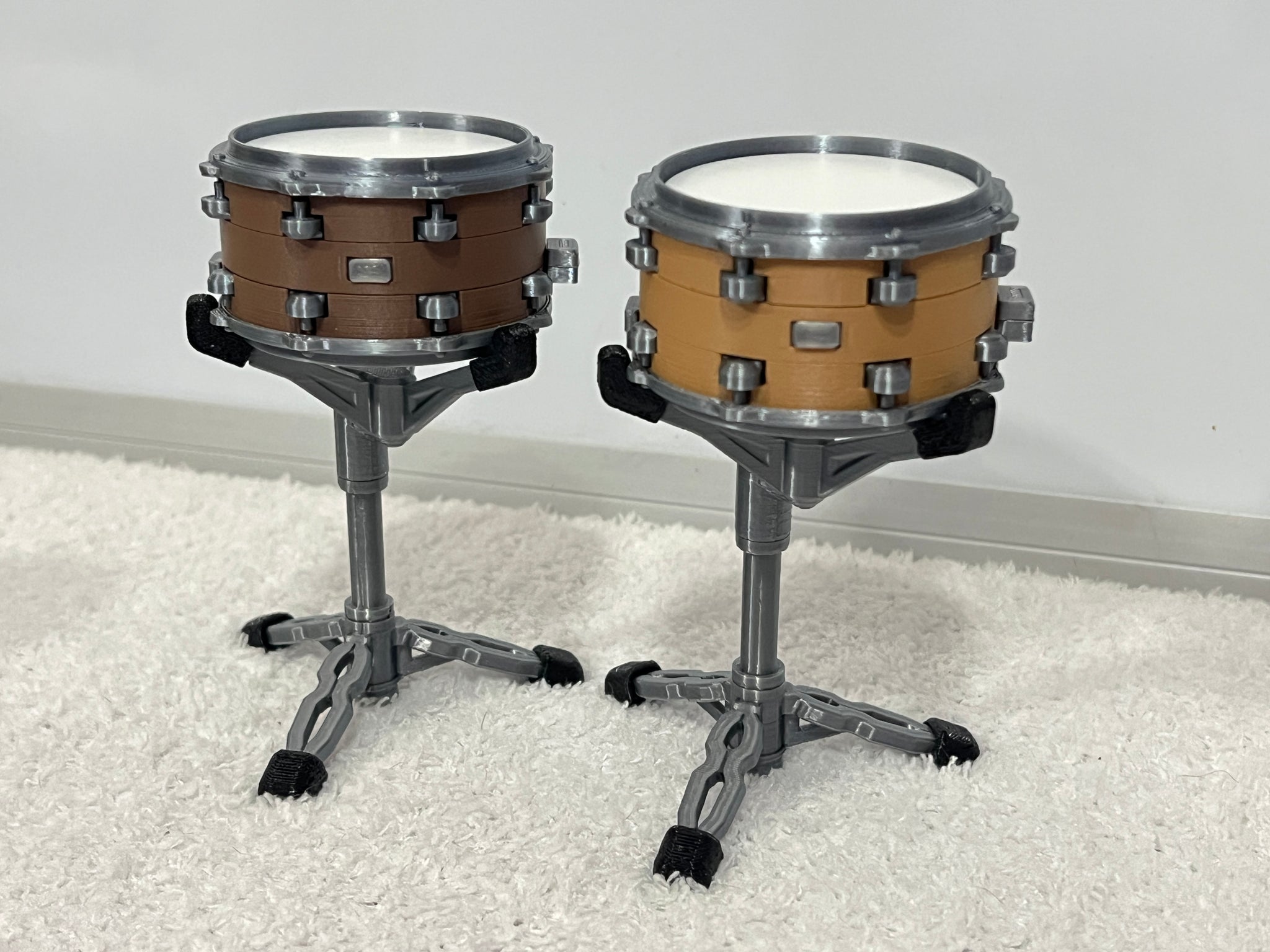 Each drum comes in 12 pieces and is very easy to build! (The badge is printed in TPU and comes pre-installed). Each stand also comes in 3 main parts, with the feet and fingers printed separately in TPU, coming to a total or 9 pieces.