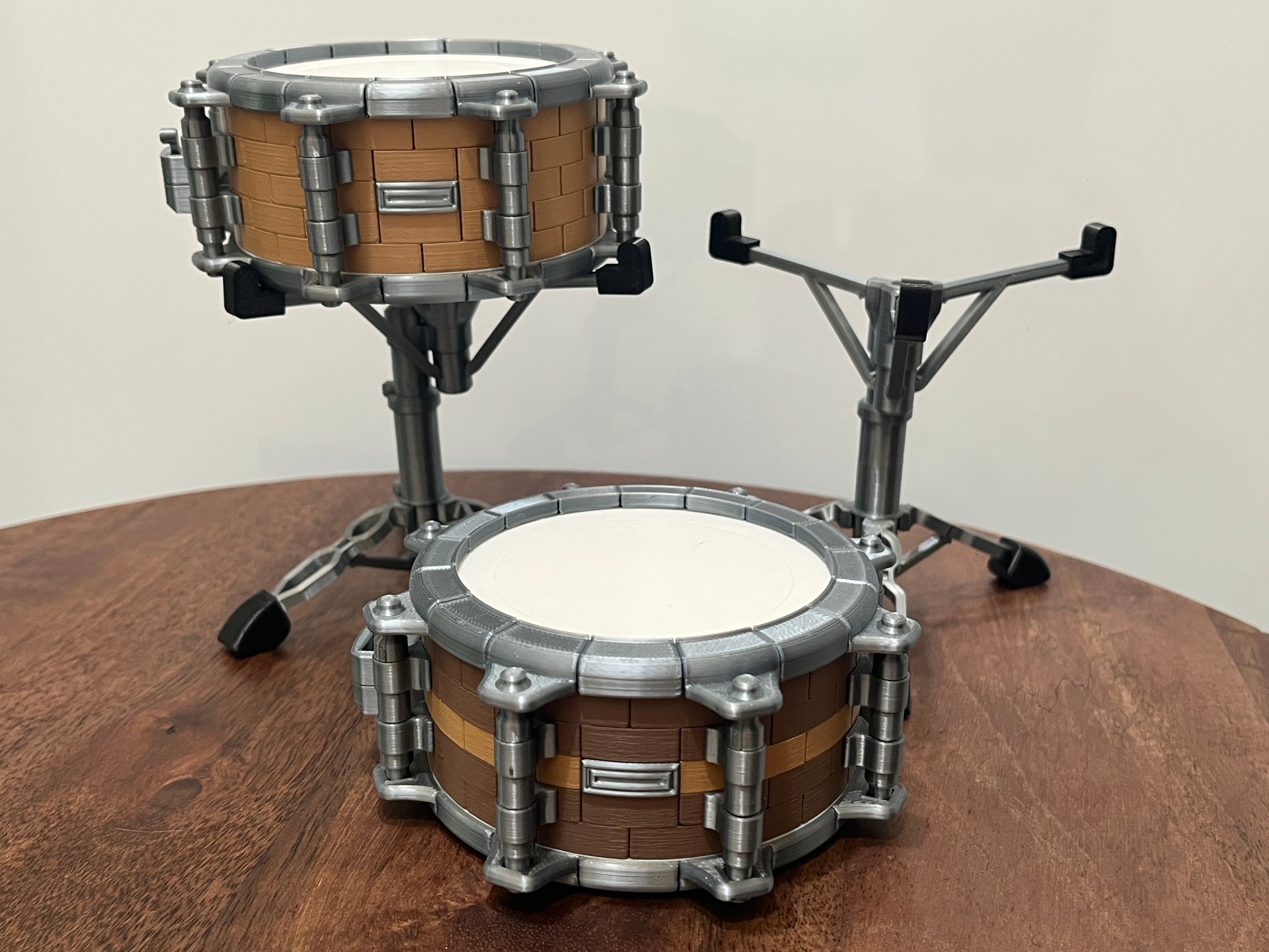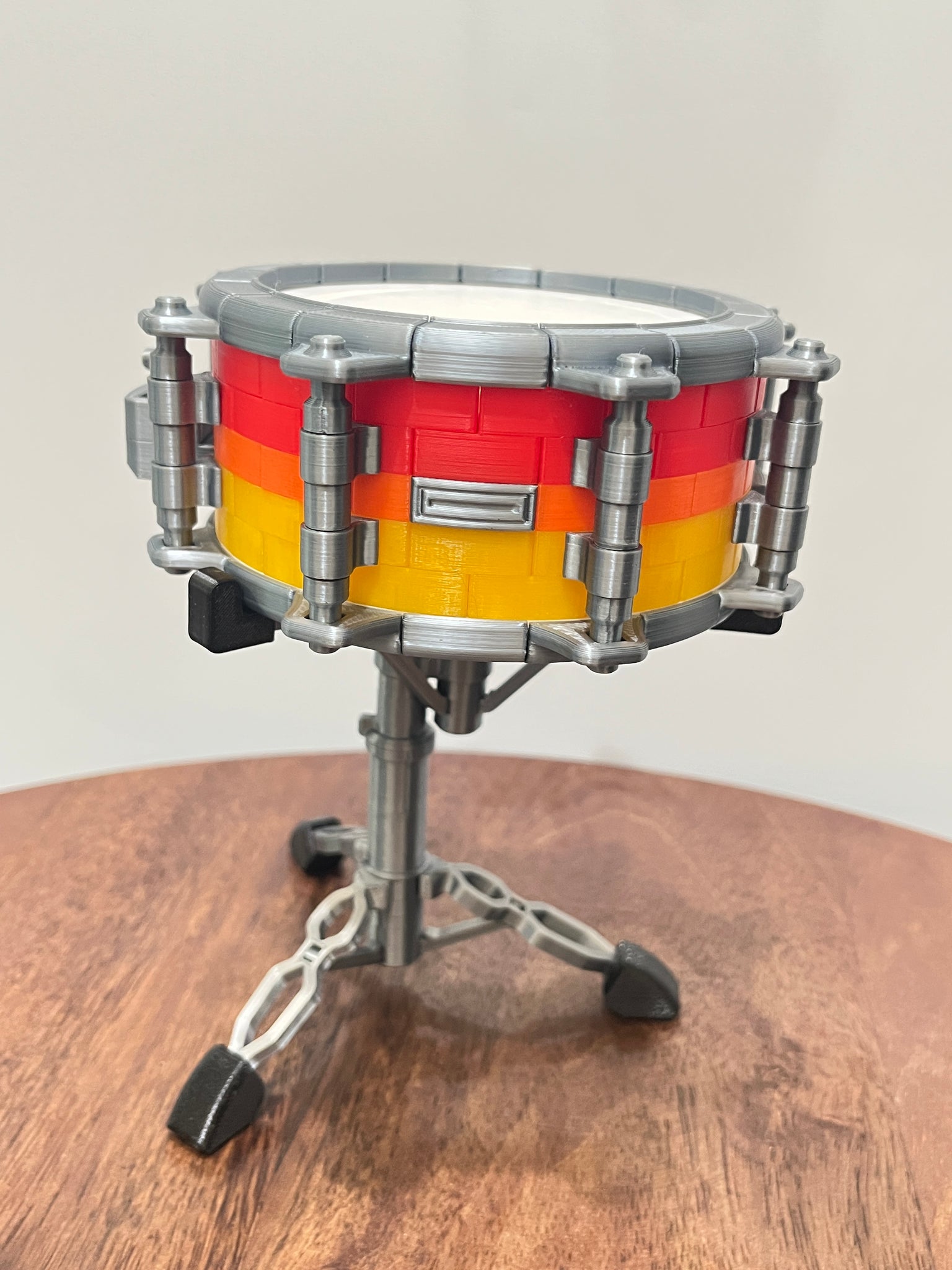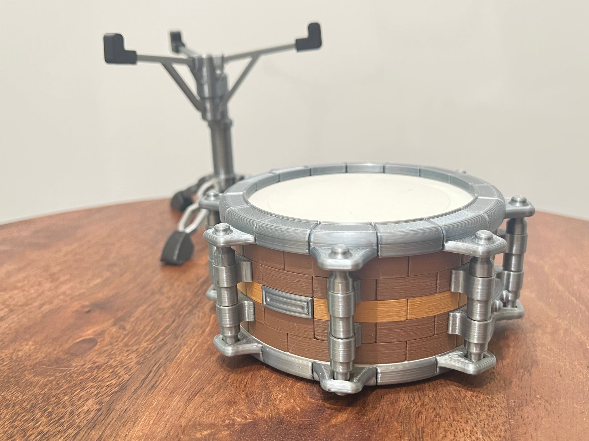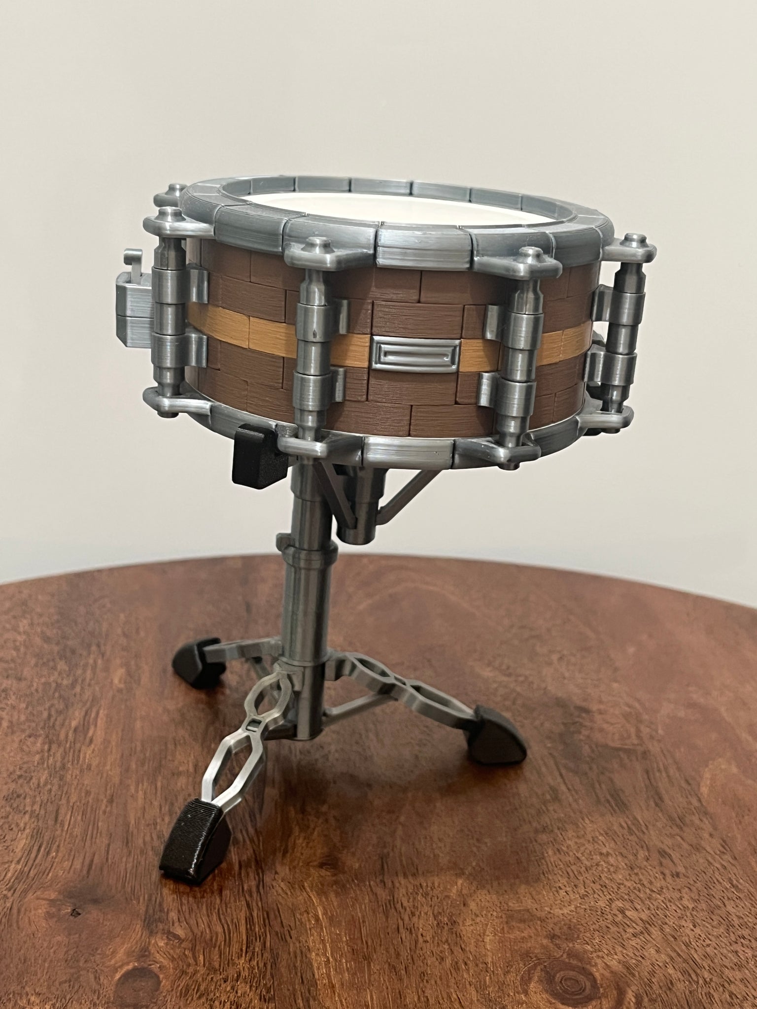Get your hands on this 1/4-scale snare drum STL pack—168 interlocking pieces (from 25 unique models) that snap together for a satisfying build. As a drummer myself, I designed this to capture the essence of a classic snare, down to the lugs, strainer, and wires, turning it into a mini masterpiece for your desk or shelf. Also included is a buildable snare stand model! This adds 24 additional pieces to the construction!