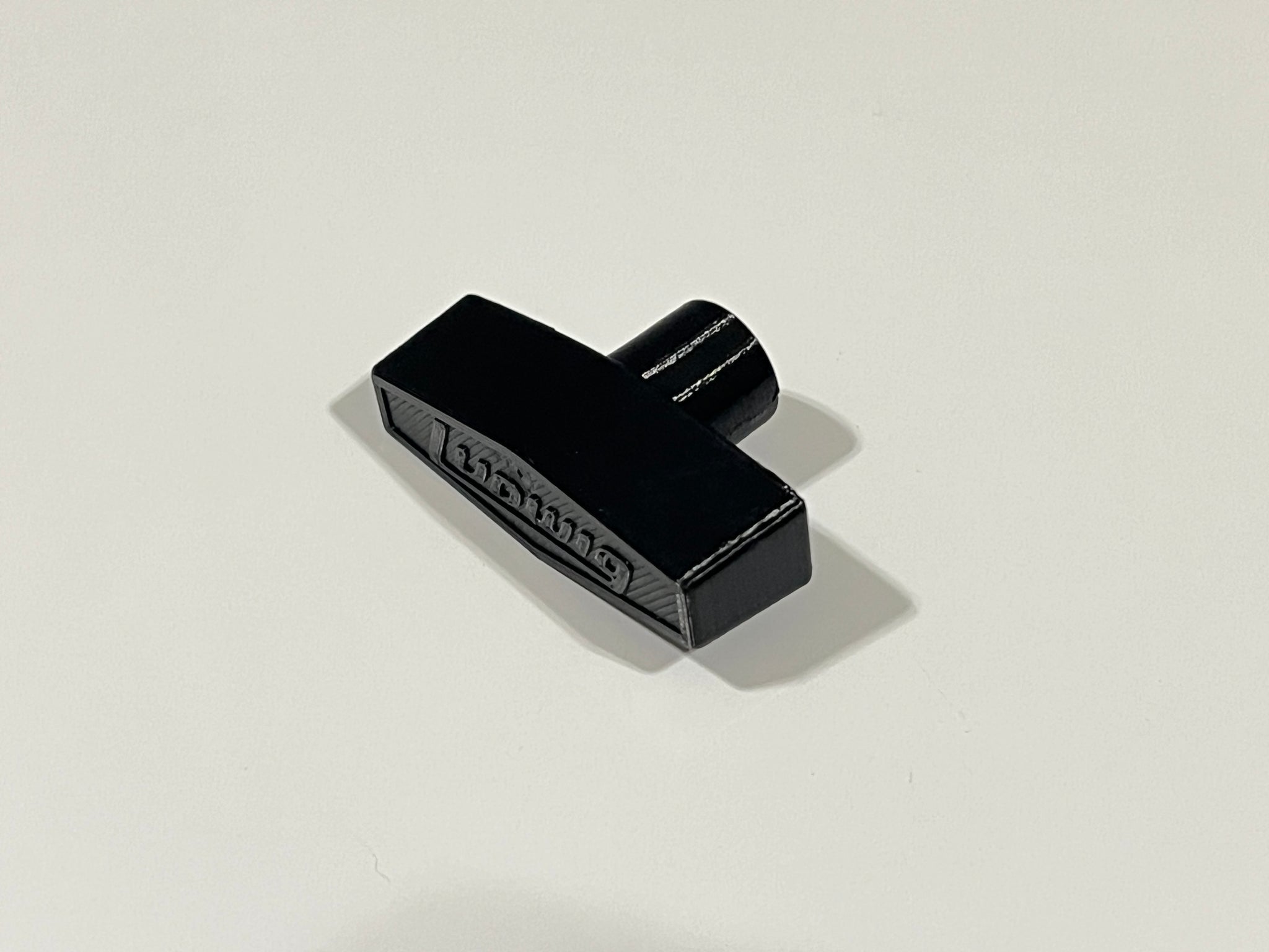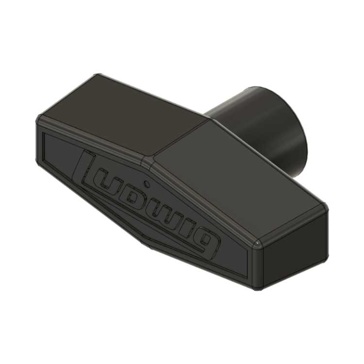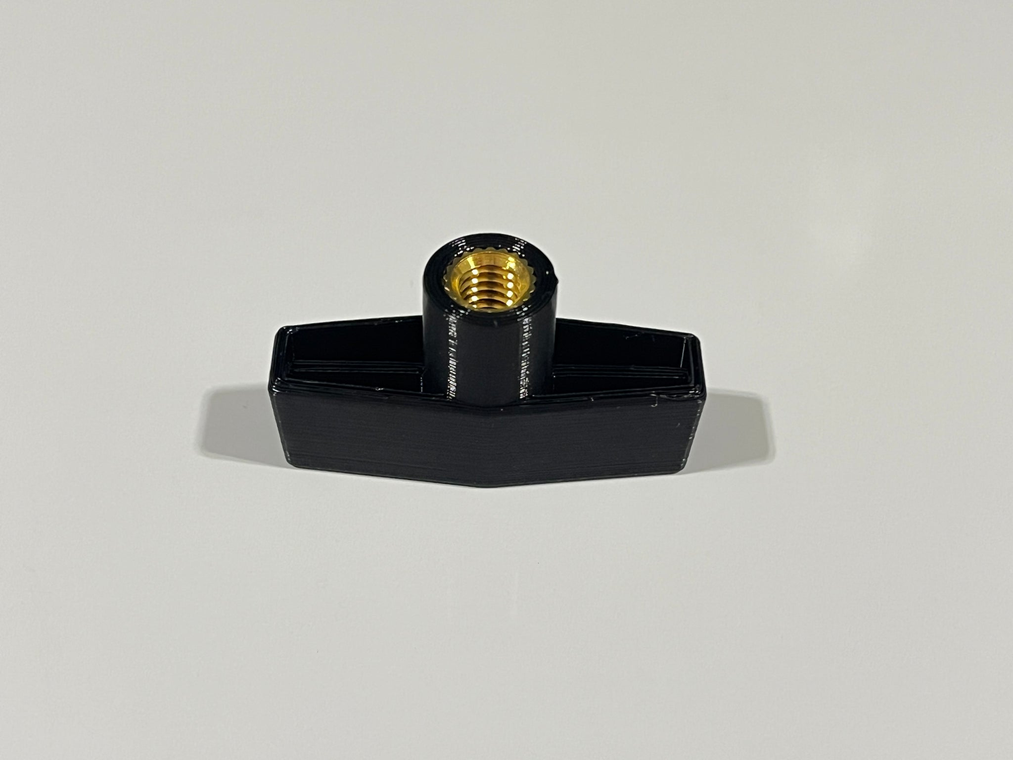 Female wingnut with the black plastic handle, in the style of the vintage Ludwig wingnuts.Available thread sizes are:5/16-18and1/4-20This part is partially 3D-printed. The threads are heat-set metal threaded inserts.